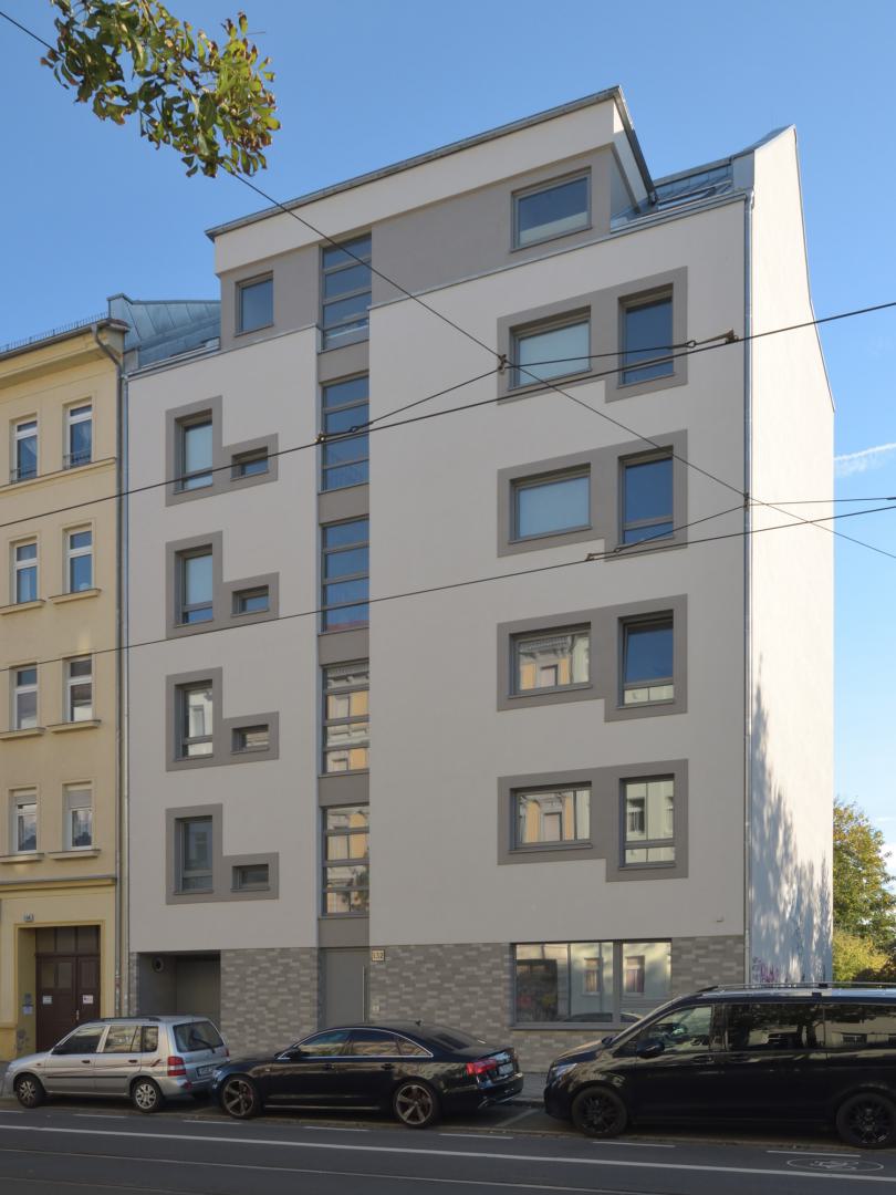 Das Baugrundstück liegt an einer Hauptverkehrsstraße im Leipziger Osten. Somit lag es von Anfang an auf der Hand, den Grundriss im Hinblick auf den Schallschutz zu zonieren - d.h., dass sich die Fenster des Treppenhauses und der Bäder zur Straßenseite ausgerichtet sind und sich die Schlaf- und Aufenthaltsräume nach Süden zur schallabgewandten Seite mit bodentiefen Fensterelementen hin öffnen. Vor diesen Fenstern befindet sich in jeder Etage eine 8m breite Balkonanlage, die gleichzeitig als Außenbereich der Wohnung sowie als Verschattung funktioniert. Die Wohnung im 5.OG hat zusätzlich eine große Dachterrasse - von hier aus gibt es einen freien Blick zum Völkerschlacht-Denkmal bzw. zum City-Hochhaus.